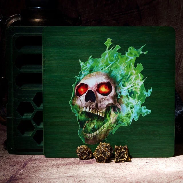 Crafted for both form and function, this tray is available in five striking color finishes and features deep engraving designs ranging from arcane horrors to fiery dragons.