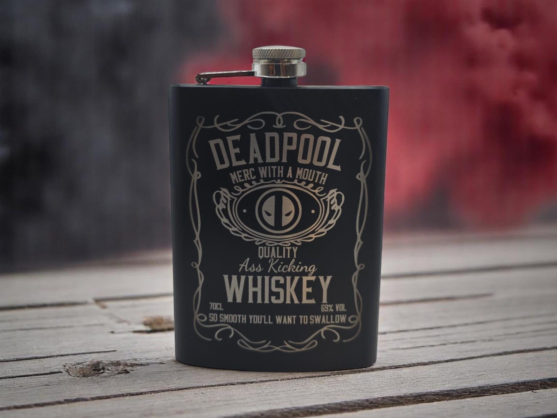 Because your drink deserves a side of chaos. This 8oz Deadpool flask is laser-engraved with the Merc with a Mouth and built for anyone who enjoys sarcasm with their sips.