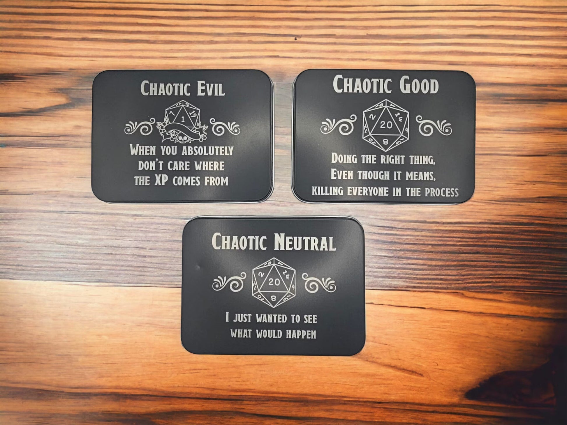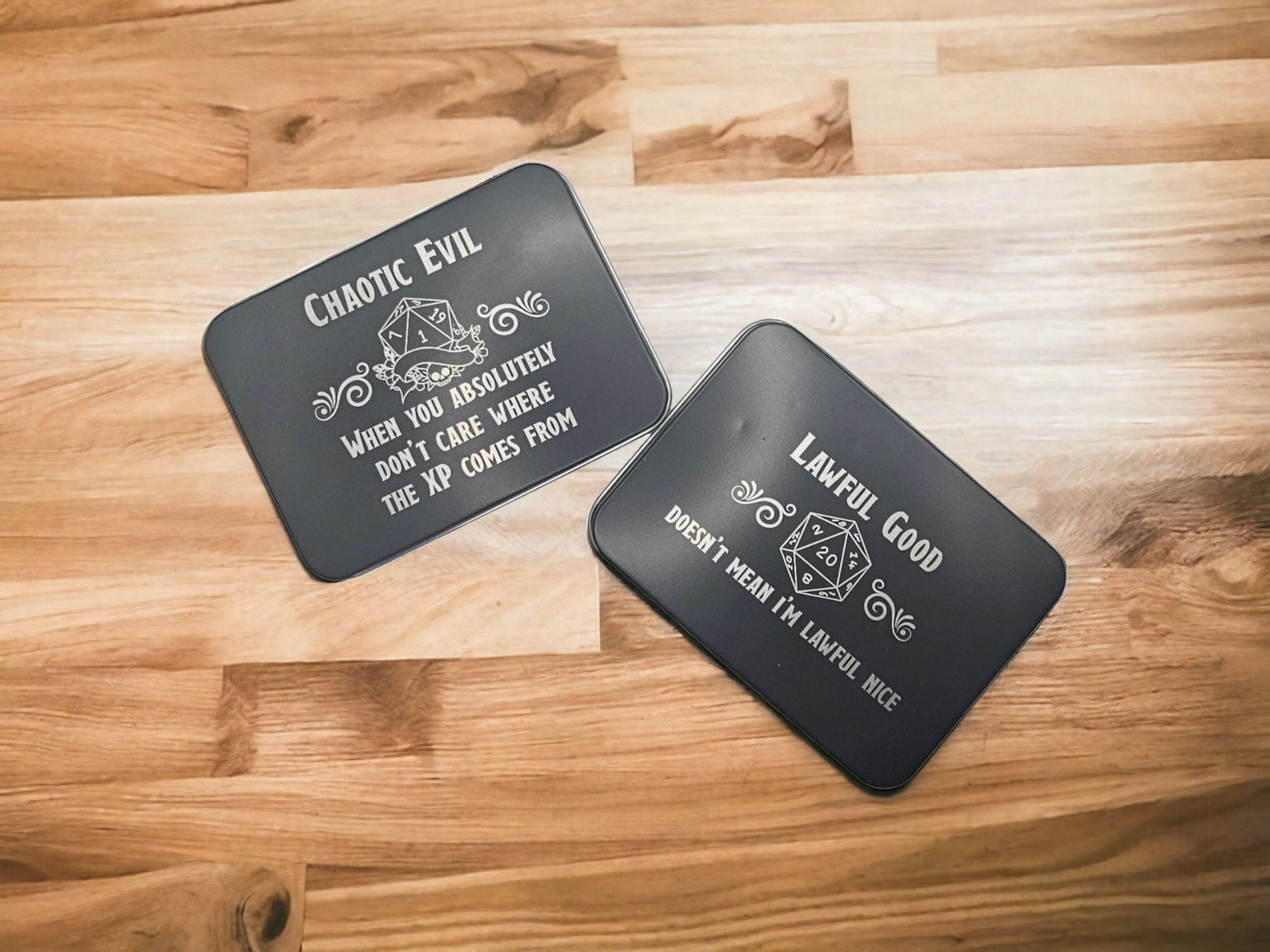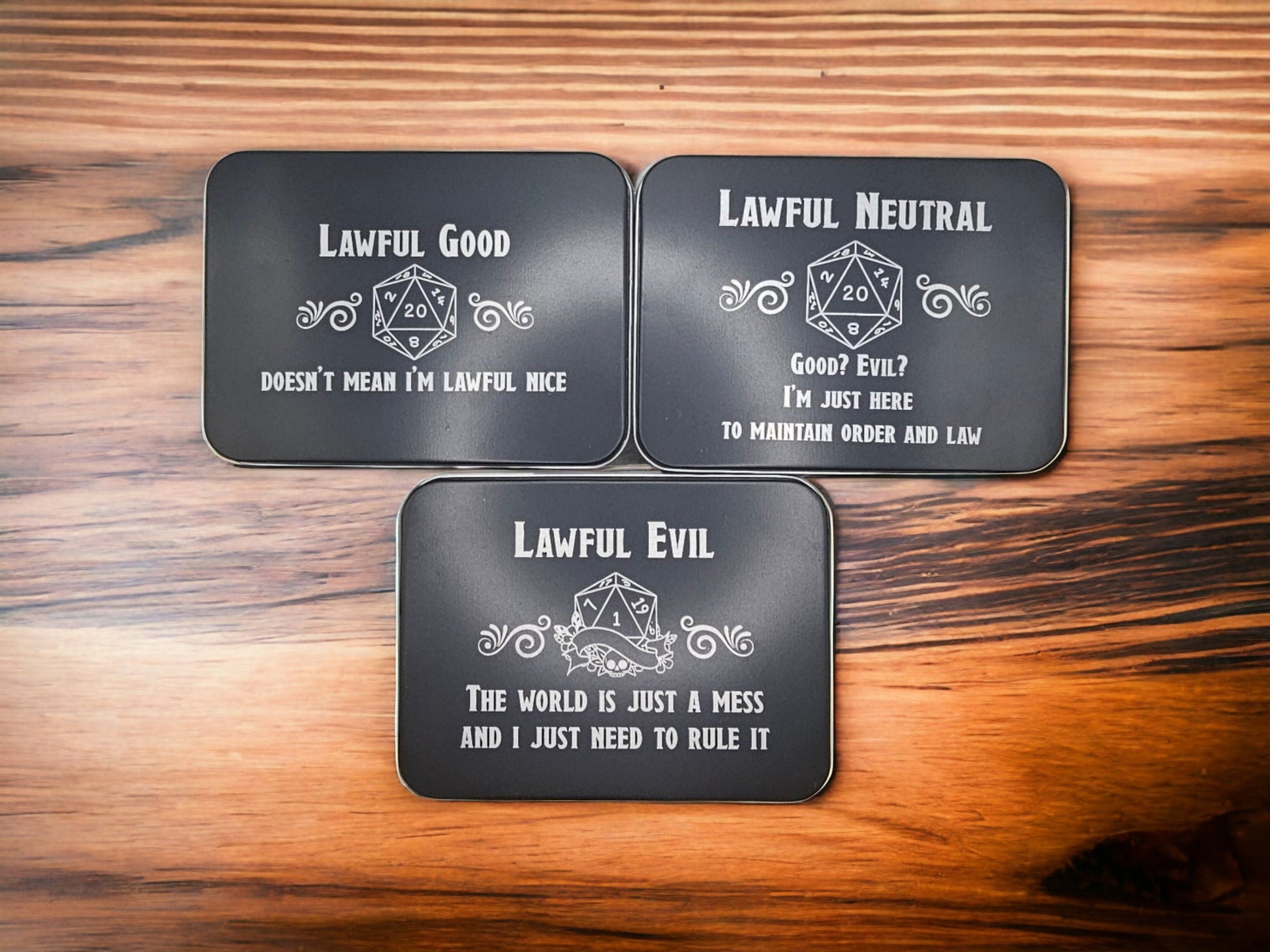 Show off your true alignment—with a twist. This engraved metal dice tin features one of the 9 classic RPG alignments, each paired with a brutally honest or hilariously relatable quote. Whether you're a Lawful Good rules lawyer or a Chaotic Neutral agent of mayhem, there's a lid that captures your tabletop soul.