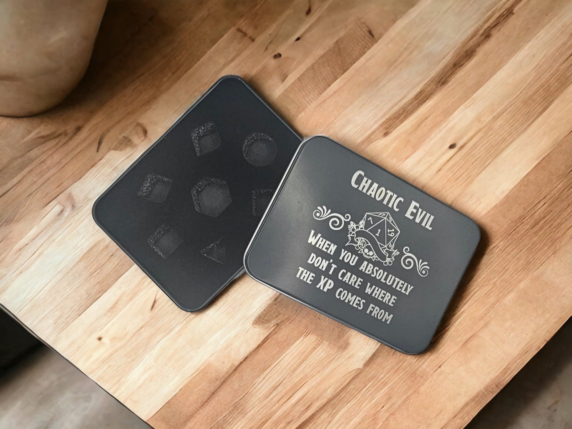 Each tin is designed to hold a standard 7-piece RPG dice set, with a foam insert to keep your click-clacks safe between questionable decisions.